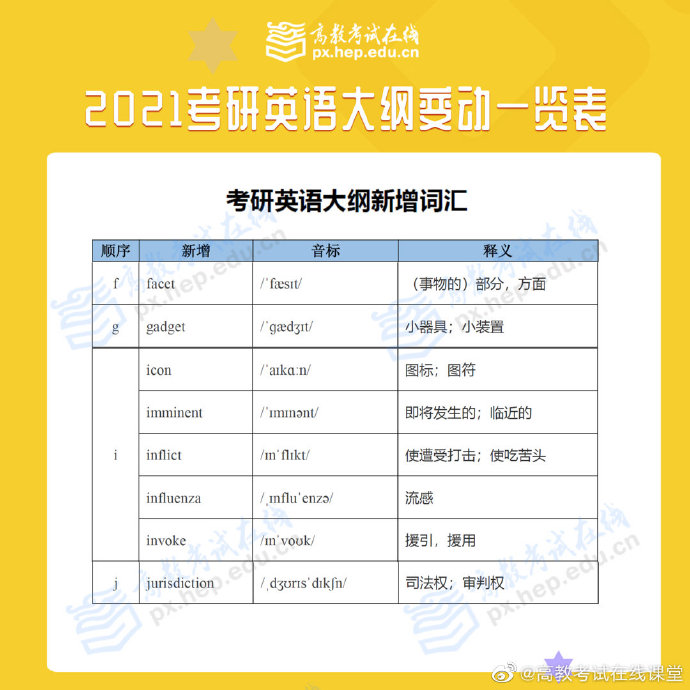 根据高等教育出版社消息,2021全国硕士研究生招生考试大纲在9月9日正式发布上市,9月10日大纲内容公布!考研大纲规定当年全国硕士研究生入学考试相应科目的考试范围、考试要求、考试形式、试卷结构等权威政策指导性考研用书,对考生备考至关重要!点击预约2021考研新大纲解析峰会,带你深度解析新大纲变化,开启高效复习之路!2021考研英语大纲已出,一起来看看到底哪里有变动吧