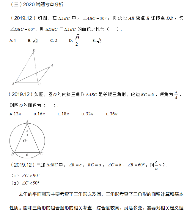 平面图形部分属于初数当中的几何部分所考查的内容,知识点较多、主要是对基础图形性质、公式计算的考查。平面图形主要包含了三大基础图形:三角形,四边形,圆。我们针对2020年考研试题的应用题部分给各位同学分析一下我们平面图形部分考查的重难点,以及我们的应对思路。