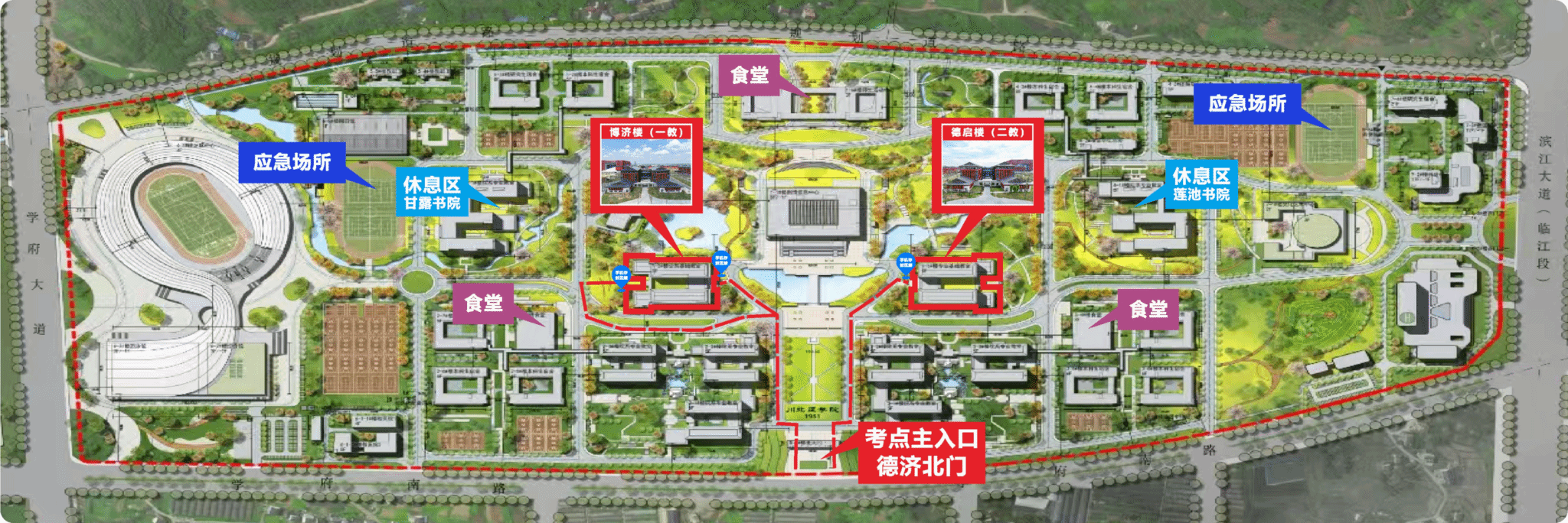 1.临江校区地处南充市顺庆区学府大道二段医大北路,距离市中心商圈约12公里,车程需30-40分钟。目前校区必经的学府大道一段至诚勇路交叉口路段正进行道路升级施工,施工区域采取半幅通行措施,易在早高峰出现拥堵。为避免耽误考试,建议考生于12月19日下午前往考点熟悉环境,确认考场位置及周边设施分布;考试当天务必提前1.5-2小时出发,预留充足的通行缓冲时间。
