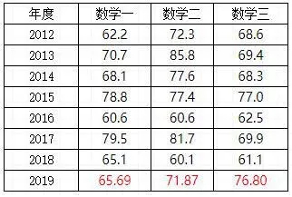 2019考研数学真题国平均分情况如下:数学一65.69 难度系数0.438 难度偏大数学二71.87 难度系数0.479 难度略大数学三76.80 难度系数0.512 难度适中这里将往年平均分一起作了一个对比,结果如下: