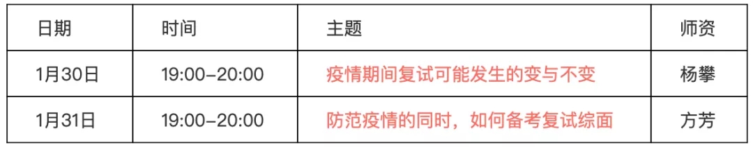 现在的这些都只是大家的猜测,具体的复试时间和方式大家要多关注报考院校的官网。但是对于可能会发生的改变,20 考研的小伙伴们要怎么应对呢?1 月 30 日、1 月 31 日,我们邀请杨攀老师和方芳老师,给大家解读——当复试遇上疫情,我们该何去何从?