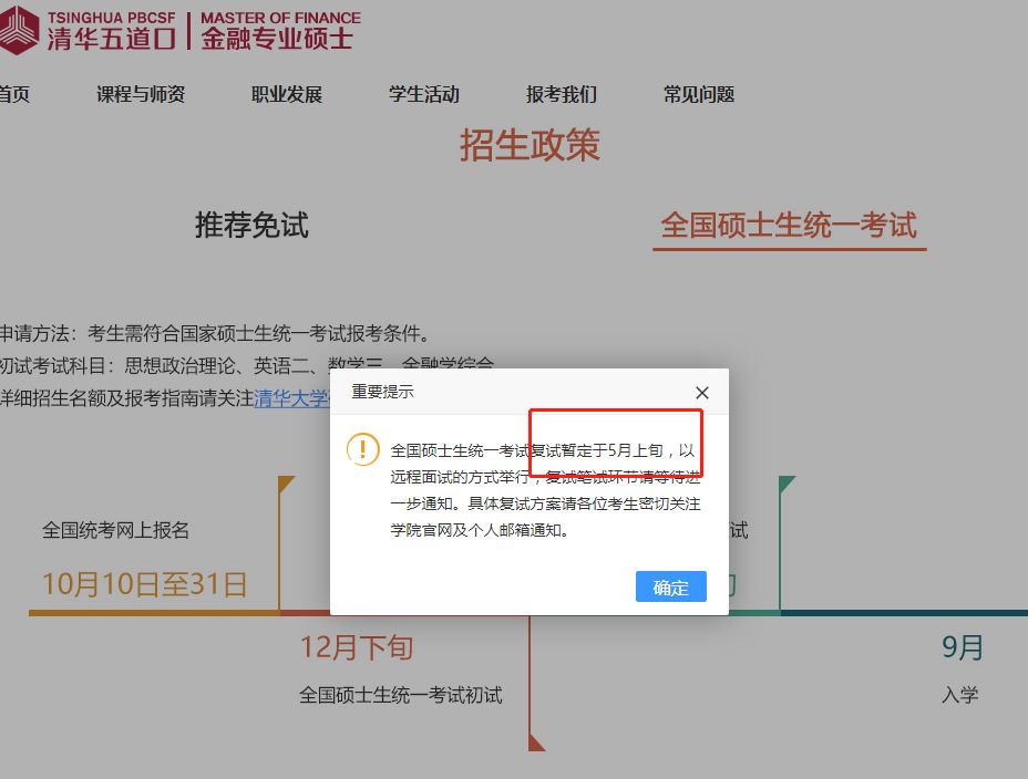 近日,根据清华大学五道口金融学院官网的信息显示,全国硕士生统一考试复试暂定于5月上旬举行。但去清华官网核实发现院校已将该弹窗删除。2020考研复试将于5月上旬举行?跟随中公考研小编一起了解一下吧~