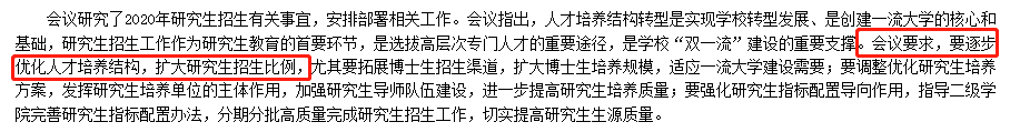 会议研究了2020年研究生招生有关事宜,安排部署相关工作。会议指出,人才培养结构转型是实现学校转型发展、是创建一流大学的核心和基础,研究生招生工作作为研究生教育的首要环节,是选拔高层次专门人才的重要途径,是学校“双一流”建设的重要支撑。会议要求,要逐步优化人才培养结构,扩大研究生招生比例,尤其要拓展博士生招生渠道,扩大博士生培养规模,适应一流大学建设需要;要调整优化研究生培养方案,发挥研究生培养单位的主体作用,加强研究生导师队伍建设,进一步提高研究生培养质量;要强化研究生指标配置导向作用,指导二级学院完善研究生指标配置办法,分期分批高质量完成研究生招生工作,切实提高研究生生源质量。