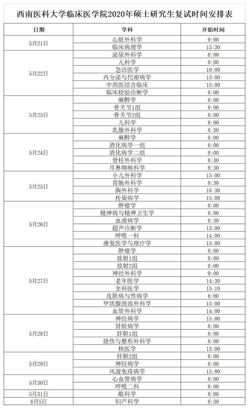 西南医科大学临床医学院2020年硕士研究生复试时间安排表