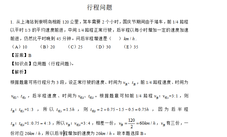 从上海站到崇明岛相距120公里,驾车需要2个小时,国庆节期间由于堵车,前1/4路程以平时1/3的平均速度前进,中间1/4路程正常行驶,后半程以每小时增加一定的速度加速前进,仍然比平时晚到45分钟。问后半程增速是(   )