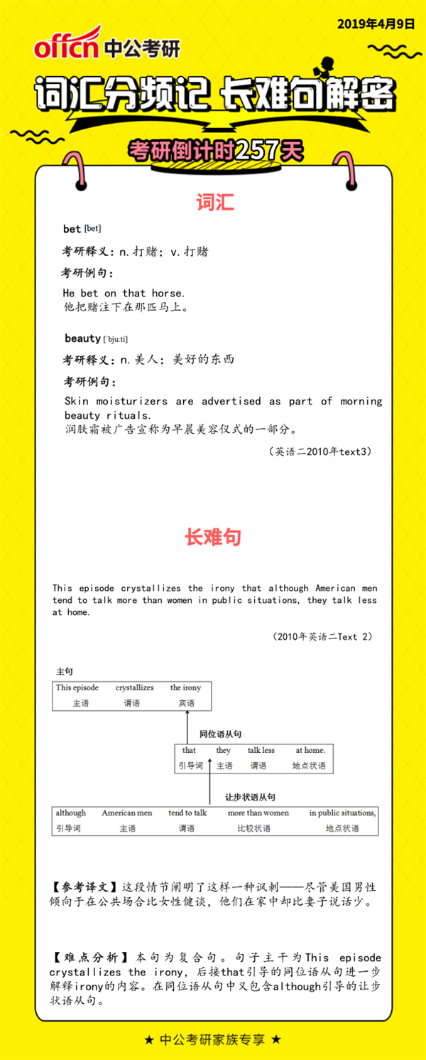 亲爱的各位小可爱们,本文是四川中公考研网小编整理的关于“2020考研英语:英语词汇分频记及考研英语长难句解密0409,的相关资讯信息,供大家参考,希望对你们的英语有所帮助。另外每天都要对自己所学的知识学会“复盘”哦。