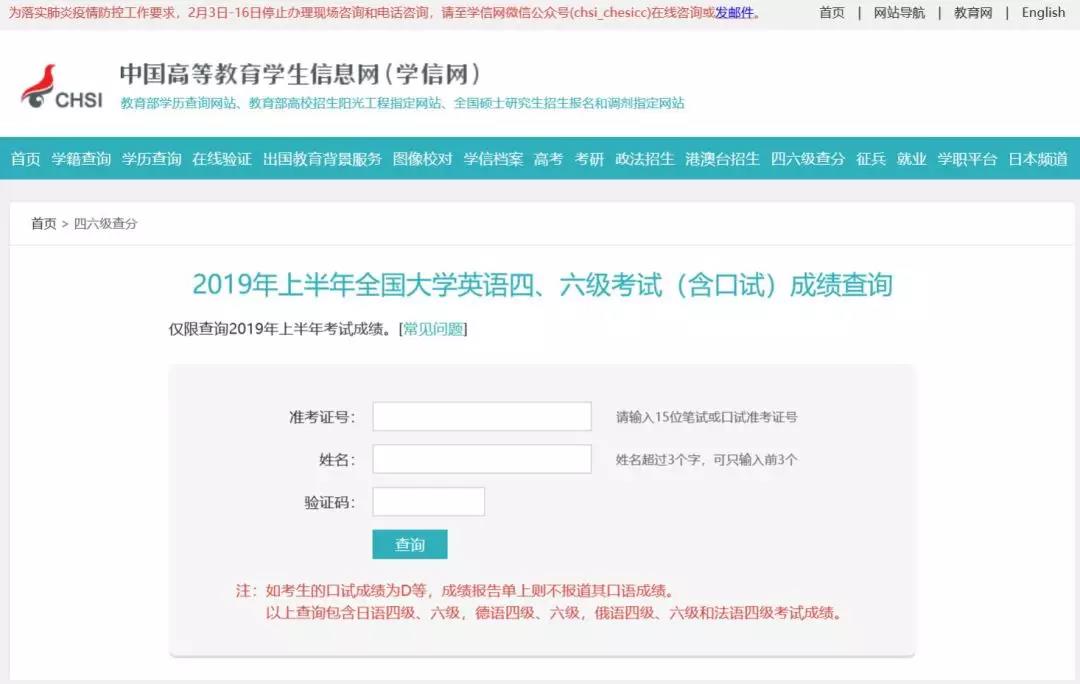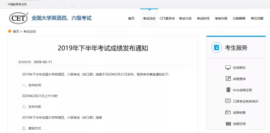 教育部考试中心发布了《2019年下半年考试成绩发布通知》(点击“阅读原文”即可查看原文件),2019年下半年全国大学英语四、六级考试(含口语)成绩将于2020年2月21日发布。