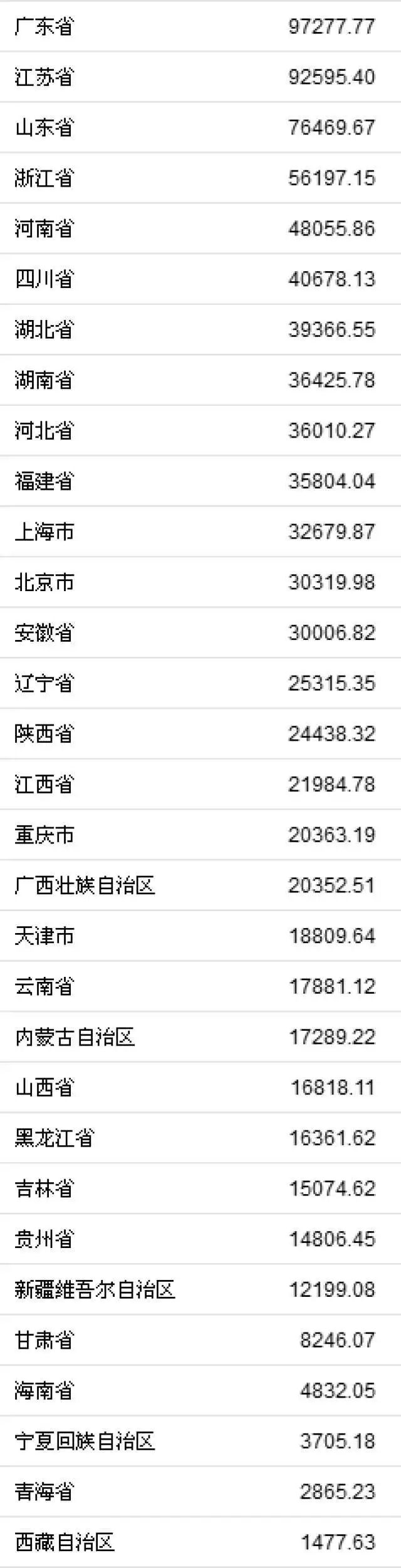 各省份GDP数据列表如下: