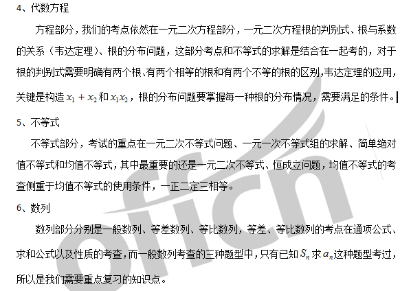 代数部分的知识点较多,也是考试的重点所在,考试中的难题大都出在这部分,这部分的题的特点是综合强,其中一个知识点不会,你可能就解不出题,所以我们必须明确它的考点: