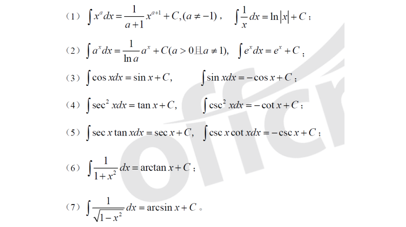 首先,我们在求解积分问题的时候,基本的方法是利用12个基本积分公式来进行求解,由于不定积分是求导的逆运算,这几个公式是根据基本求导公式推过来的,这也是我们在求解考研数学中积分问题的基础,之后的其他方法也是将一个复杂的积分问题转化为一个或几个基本积分公式进行求解,下面则是我们的基本积分公式展示: