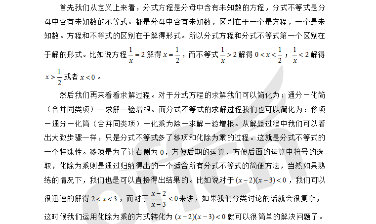 后我们来从注意事项上来看。对于分式方程来说,我们只需要在计算方面和验证增根方面多注意就可以了。计算需要细心和考虑需要面,难度不是很大。而对于分式不等式来说,我们需要注意的点就相对来说多一点。移项我们要注意正负号的变化;通分、化简和求解则在计算能力上有较好的要求;化除为乘则需要同学们能提前留个心眼,要跟后面的验证增根的问题联系起来,方便取舍,千万不要随手填了答案!