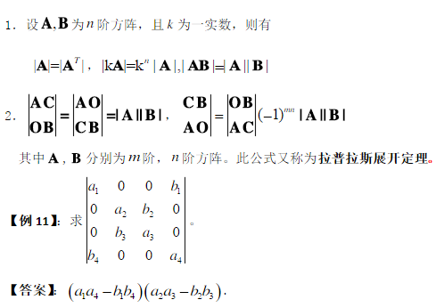 【小结】:本题用到了分块矩阵行列式的计算公式,也即拉普拉斯展开式。它在行列式计算中的作用与行列式的展开定理类似,都是将行列式降阶,进而降低计算难度。而通常情况下,它降阶的速度往往比展开定理更快。一般来说,当行列式中有较多的零时,就可以考虑利用行列式的性质将零集中起来,组成分块矩阵再进行计算。