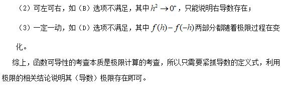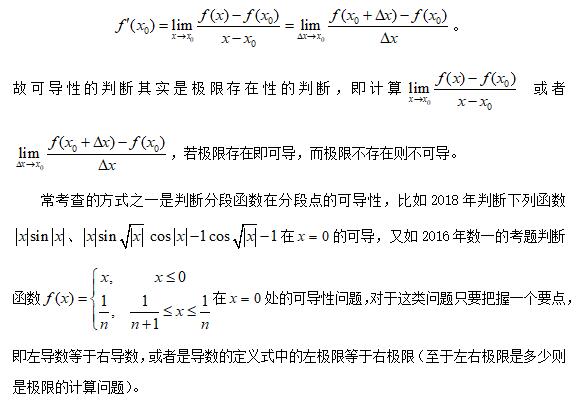函数可导性的本质考察的是导数的定义,函数在某一个点的导数存在即函数在这个点可导,而导数的定义需要掌握其定义式