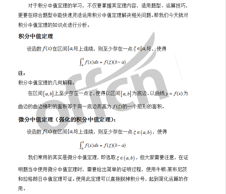 以上就是积分中值定理的内容,希望同学们使用一些考研试题:一、熟练掌握积分中值定理的使用方法,二、掌握并熟悉各种题型的解题技巧。