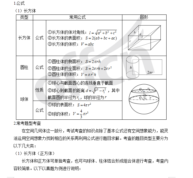 在空间几何体这一部分,主要涉及到长方体、正方体、柱体以及球体等几何体的表面积、体积以及利用体体组合尤其是与球体的组合(内外接)去进行相关求解。下面就针对空间几何体的常用公式和几大常考题型进行总结。