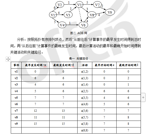 在AOE网中有些活动可以并行地进行,所以完成工程的最短时间是从开始点到完成点的最长路径的长度(这里所说的路径长度是指路径上各活动持续时间之和,不是路径上弧的数目)路径长度最长的路径叫做关键路径。关键路径上的所有活动都是关键活动(即最迟开始时间等于最早开始时间的活动)。只要找到关键活动,就找到了关键路径。