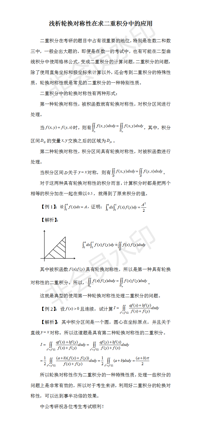 考研初试倒计时8天了,相信大家都能在考场上发挥出高水平,考出好成绩。以下是四川考研网研小编整理的关于“考研数学|浅析轮换对称性在求二重积分中的应用”的相关资讯信息,供大家参考。