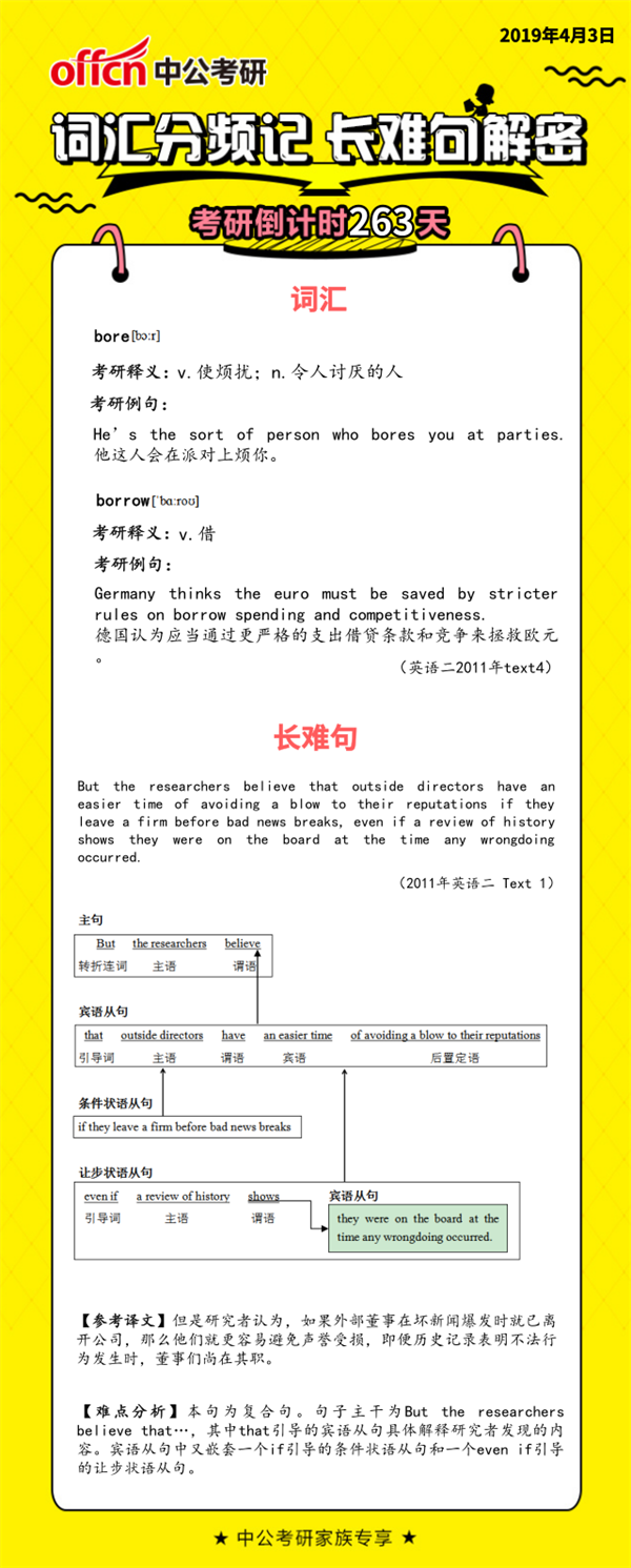 以上是四川中公考研小编为您整理的“2020考研英语:英语词汇分频记及考研英语长难句解密0403,预祝每位考生取得好成绩,更多考研常识相关内容尽在四川中公考研英语栏目,中公考研为广大学子推出乐学面授课、VIP一对一等系列备考课程,针对每一个科目要点进行深入的指导分析,欢迎各位考生了解咨询。同时,中公考研一直为大家推出考研直播课堂,足不出户就可以边听课边学习,为大家的考研梦想助力!