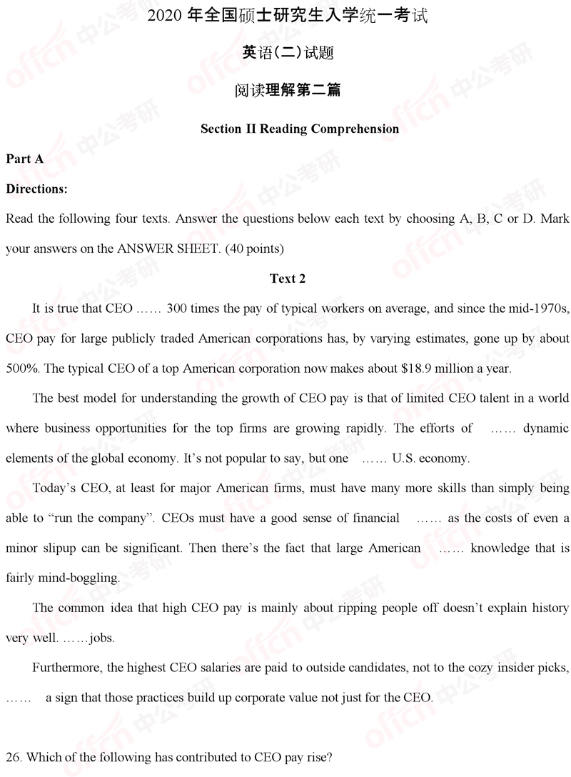 2020考研初试已正式开始,四川山西考研网初试后为大家整理发布“20考研,英语二考试答案”考研试题内容,中公考研各科研究院老师将对2020考研试题进行试题变化及难度解析,帮助大家做好考后准备、从容迎战后续复试调剂!