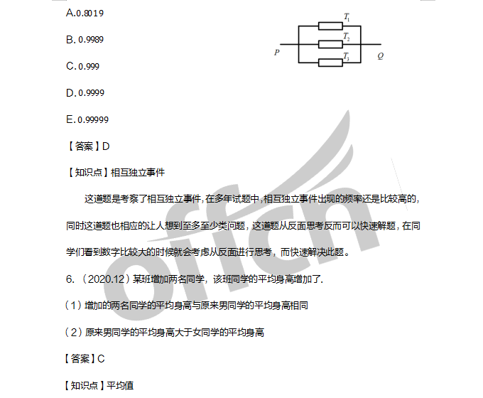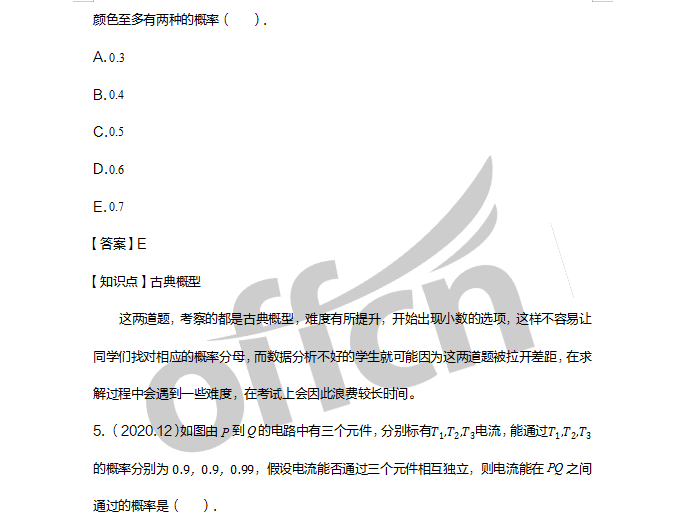 这道题是考察了相互独立事件,在多年试题中,相互独立事件出现的频率还是比较高的,同时这道题也相应的让人想到至多至少类问题,这道题从反面思考反而可以快速解题,在同学们看到数字比较大的时候就会考虑从反面进行思考,而快速解决此题。