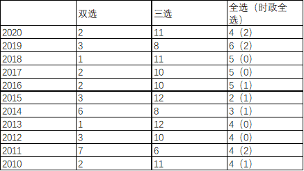 四选二所占题数的顶峰值是7(11年),四选二所占题数的最小值是1(18年)。4选2题数逐年减少,不超过5道(可能性很小),比较大可能在2~4之间。