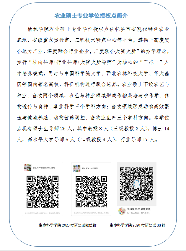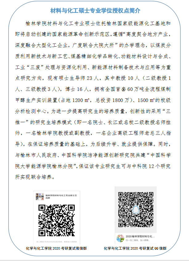 目前,我校有材料与化工、农业(农艺与种业、畜牧领域)2个硕士专业学位授权点,今年共计划招收70人,招生人数大幅增加。为了让大家更加深入地了解相关授权点招生形势与动态,我校各招生单位分别开通了咨询工作群,以方便与广大考生实时互动交流,欢迎你们通过QQ(群号:1003091096材料与化工、1067614750农业)或微信群(扫描文中二维码)直接进入,我们将认真解答大家的疑问,使大家更加深入了解榆苑。