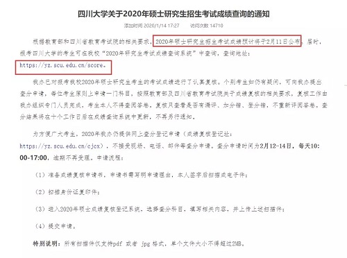 根据教育部和四川省教育考试院的相关要求,2020年硕士研究生招生考试成绩预计将于2月11日公布。