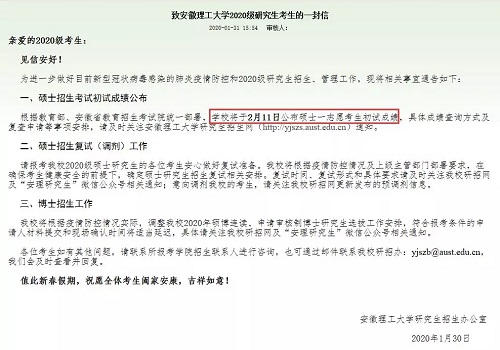 2020年硕士研究生初试成绩计划于2月10日公布。请报考我校的各位考生及时查询并安心做好复试准备。