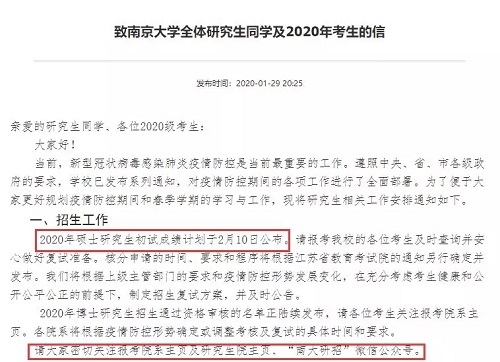 另外,川大发布通知:报考四川大学2020级硕士、博士研究生的各位考生,请合理安排时间,认真做好准备,耐心等待和关注我校正式通知。硕士研究生初试成绩查询与查分工作时间暂时不变。研究生院将根据疫情防控情况和上级主管部门安排部署,在保证考生健康和公开公平公正的前提下,合理安排硕士研究生复试以及博士研究生初试、复试相关工作。具体时间、形式和要求,请广大考生密切关注四川大学研究生招生信息网(yz.scu.edu.cn)及各培养单位网站。