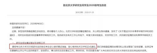 我们将根据疫情防控情况和上级主管部门安排部署,在保证考生健康和公开公平公正的前提下,安排硕士、博士研究生招生复试工作。具体时间、形式和要求请广大考生密切关注北京大学研究生招生网站相关信息。