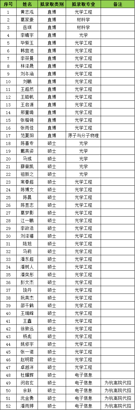 中科院上海光机所2021年推荐免试研究生拟录取名单如下: