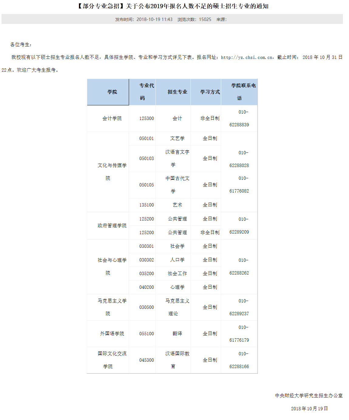 遗憾的是,几乎没有学校会在报名结束之前公布今年的报考情况,有的只可能是像央财一样发布紧急通知报考不足的职业。部分院校会在明年录取结果公布之后统计当年的报录情况。