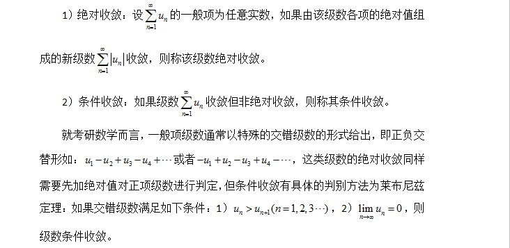 根据以上内容,不难发现对于一般项级数敛散性判定题目的思路为:1)先对级数加绝对值,得到正项级数,按照正项级数的判别发进行敛散性的判断,若收敛则称为绝对收敛,若发散,则进入第二步。2)对于加绝对值不收敛的级数,使用莱布尼兹进行条件收敛的判断。若两个条件均满足,则称条件收敛;若两个条件中任意一个不满足,则称发散。