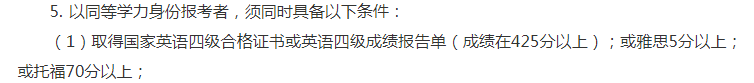 大多数学校对英语水平有要求,比较常见的是:取得国家英语四级合格证书或英语四级成绩报告单(成绩在425分以上)。也有学校雅思5分以上或托福70分以上可以报考。