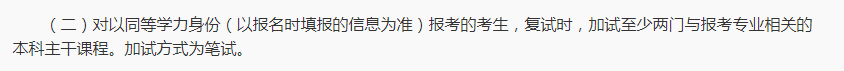 要求以同等学力身份(以报名时填报的信息为准)报考的考生,复试时,加试至少两门与报考专业相关的本科主干课程。加试方式为笔试。